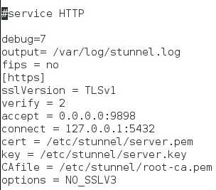 As requested, Posting my configuration. [https-App-setup] client = yes accept = 9898 connect = <<source-ipaddress>>:9898 cert = <<stunnel-installationdirectory>>\config\App\morpheus.pem key = <<stunnel-installationdirectory>>\config\App\morpheus.key CAfile = <<stunnel-installationdirectory>>\config\App\root-ca.pem sslVersion = TLSv1 options = NO_SSLv3