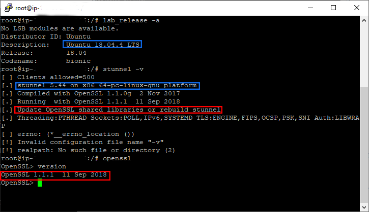 I installed Stunnel4 via apt-get install command. The version you installed for me is old (5.44), I have tried updating it via apt-get update but there are no updated packages in Ubuntu 18.04. Is there a way to update it and keep it working as a service like before? Attached screenshot with linux, stunnel and openssl versions. Any other additional data you need to provide just ask me. [image: stunnel.png]