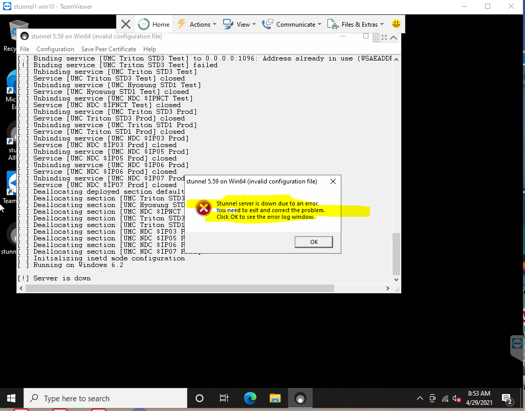 I'm running win64 version 5.59. Installed service and it is started and running (set to automatic). But when I try to open the stunnel allUsers I get the error : stunnel server is down sue to an error, you need to exit and correct the problem. Click ok to see the error log. Shouldn't I be able to open the log window if the service is running? Also when the service is running there is no stunnel icon in the system tray. Please advise. Thanks [cid:image001.png@01D73CD5.3C81D040]