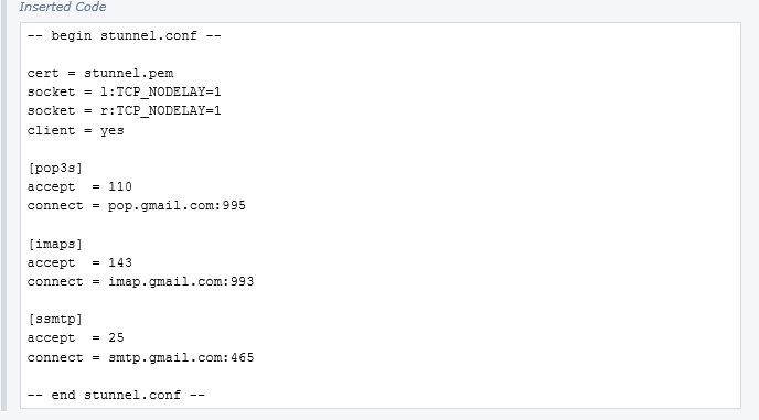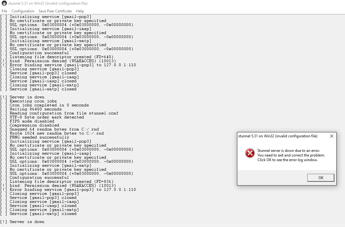 Installed stunnel-5.31 (stunnel-5.31-installer) so that I can get MT4, a Forex trade platform, to send me mails to my Gmail account. I was told this was necessary because MT4 doesn't support SSL Authentication. I attempted to start and received this; [image: Inline image 1] It looks like a config file issue but also would not bind? Is this one issue? I was told all I needed to do with the config file is this; [image: Inline image 2] Can you please simply help me with the config file? I'm lost and need help. Thanks to all in advance for your help.