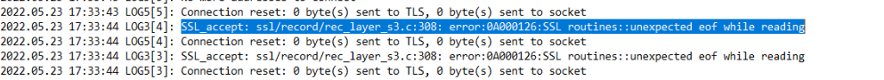 Stunnel User, When we upgrade from 5.60 to 5.63 or 5.64 we start to get the unexpected eof while reading on the SSL_accept log. I re-loaded 5.60 and the error went away. Does anyone have any ideas on what to review to solve this issue? [cid:[email protected]] Joe Sterk CIO (Chief Information Officer) [Description: Description: cid:[email protected]] Insurance Services Corp. ? (972) 896-0384 (Mobile) * (707) 303-8105 (Work) * [email protected]<mailto:[email protected]>